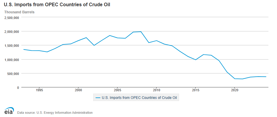 And I’d like everyone to burn one chart in your mind as you’re filling up your tank this weekend. It’s a simple chart that shows how much we relied on OPEC for our oil supply before the shale boom took off: